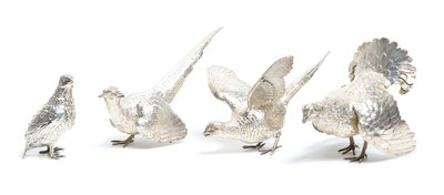 comprised of a German .800 Bird with upright tail feathers and slightly out-stretched wings, a Partridge shaped shaker, marked 925 and a pair of Partridges, total weight 44.65 Troy ounces.