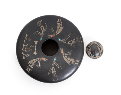 the first a flattened seed jar having six pollinator figures with turquoise and coral bead decoration together with a miniature frog pot, the firstsigned Golden Rod and dated 4/6/77, the second also signed.