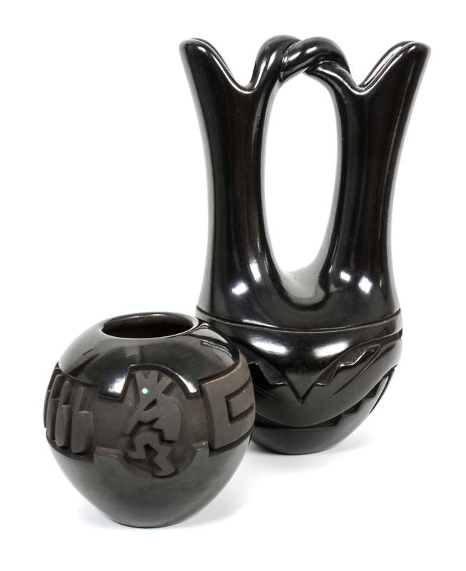 the first a wedding jar having carved Avanyu design, signed Reycita Naranjo, Santa Clara Pueblo NM, together with carved blackware pot with Kokopelli figures, signed Harrison & Marie, '94.