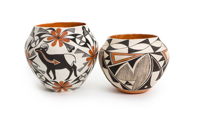 the first with heartline big horn sheep, signed M. Antonio, Acoma, N.M., the other with geometric design signed M. Torivio.