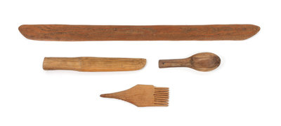 together with a weaver's fork, batten, knife and wooden spoon. 6 items total.