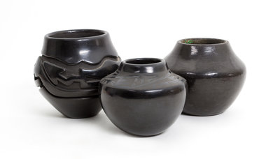 including a San Ildefonso jar signed Angelita Sanchez, a carved Avanyu jar by Stella Chavarria and the third an Apache jar by Llayda Rodriguez, Apache Dolche.