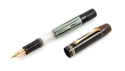 having a green marbled case with a 14-karat gold fine nib.