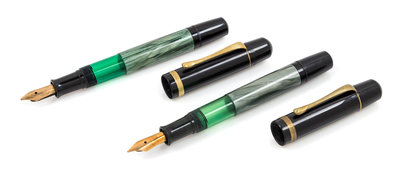 each having a green marbled case with 14-karat gold Pelikan nibs.