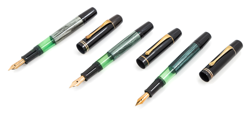 comprising a pair with a green marbled case and a a gray marbled example, each having a 14-karat gold Pelikan nib.