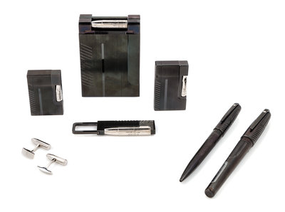 numbered 128 and comprising a fountain pen, ball-point pen, two pocket lighters, Jeroboam lighter, key ring and pair of cufflinks with a display case.