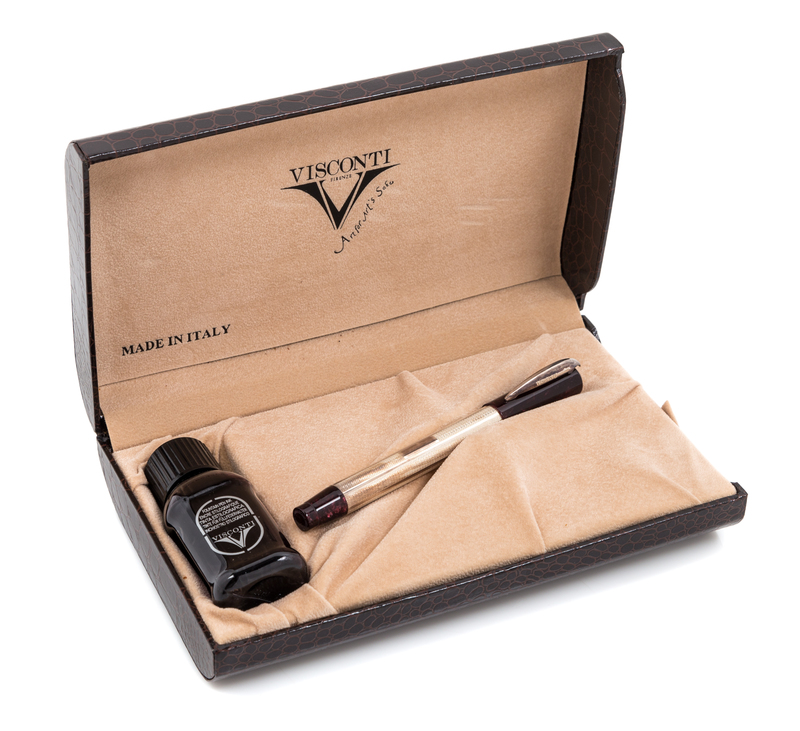 having a medium nib with a black-ink bottle and a factory original box and display case.