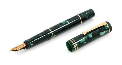 numbered 1083/1921 and having an 18-karat gold medium nib with a green ink bottle and a factory original box, display case and certificate with papers.