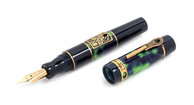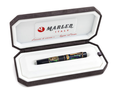 series number 0355 and having an 18-karat medium nib with green and blue mottled bands on a black resin base and having a factory original box with display case.