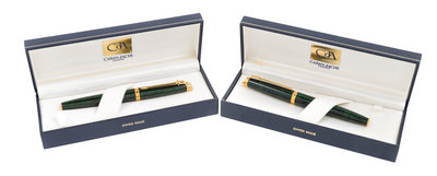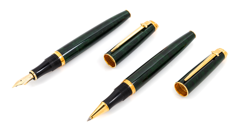 each having a green marble case with gold-plated elements, the fountain pen with a fine nib with display cases.