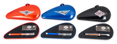 comprising an orange example decorated as a motorcycle engine, a similarly decorated blue example and a black pen with the Harley Davidson logo, each having a medium nib and a display case in the form of a motorcycle fuel tank.