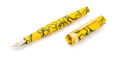 having a yellow and black resin case and having a medium nib with a display case.