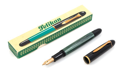 having a green-striped body with a 14-karat gold nib marked'OM', and having a vintage Pelikan factory box.