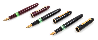 comprsing a burgundy cased fountain pen and two black examples, each having a 14-karat gold Pelikan nib.