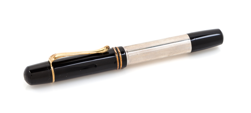 having a black resin cap with a silver case and having a 14-karat gold nib.
