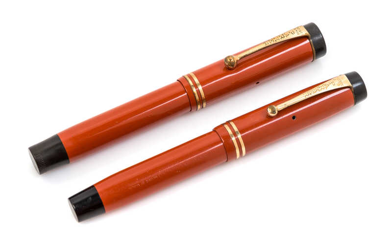 comprising a coral red cap and body, each having two thin rolled gold bands on cap with Parker nibs.