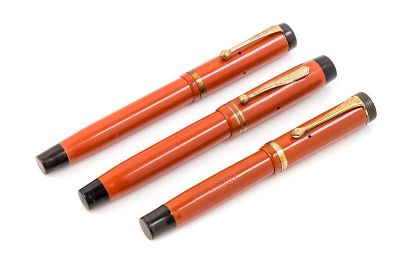 having a single rolled gold band on cap with a coral red cap and body and a Parker nib, together with a Stafford Hoover and a National Security fountain pen.