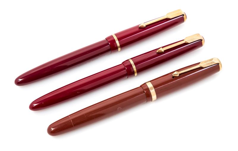 having a burgundy cap and case with a 14-karat gold Duofold nib, together with two later Duofold examples.