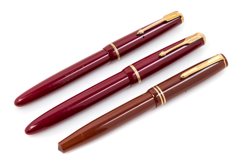 comprising a 'Popular', 'Victory' and 'Duofold' examples, each having a burgundy resin case and cap.