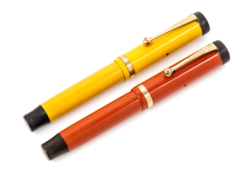 comprising a coral red and a mandarin yellow example with black end-caps and a single rolled gold band on cap with a Parker Duofold nib.