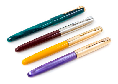 comprising an example with a pearled-purble resin body and a filled gold cap, a mandarin yellow body with a filled gold cap and a burgundy resin case with a brushed metal cap, and a pearled green example, each circa 1950.