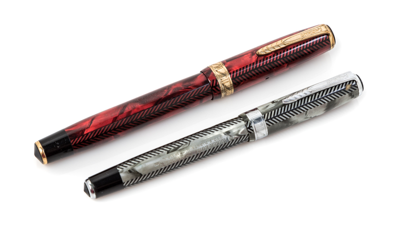 comprising a burgundy herringbone example and a silver herringbone case slender example, each circa 1930's.