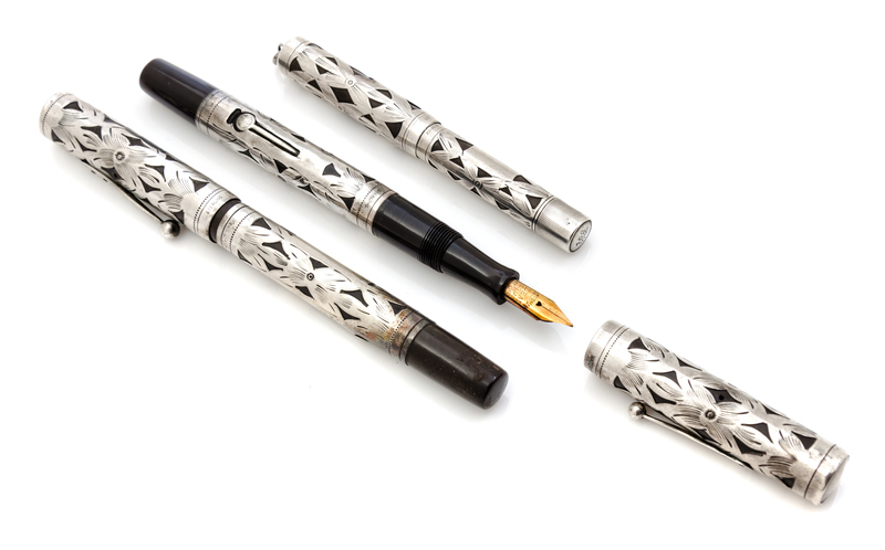 eaching having an Art Deco inspitired silver overlay cap and body and having a 14-karat gold nib, together with a similarly decorated 452 1/2V' Lady example.
