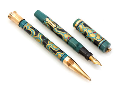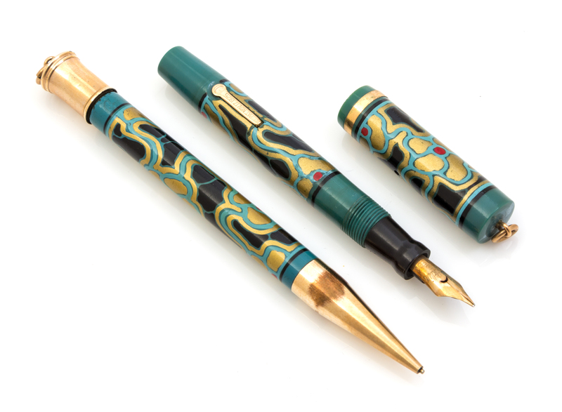 each having a polychrome decorated case in the Art Nouveau taste, the fountain pen with a Conklin '#2' nib.