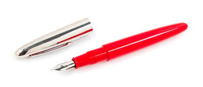 having a red resin case with a metal cap and having a bold nib.