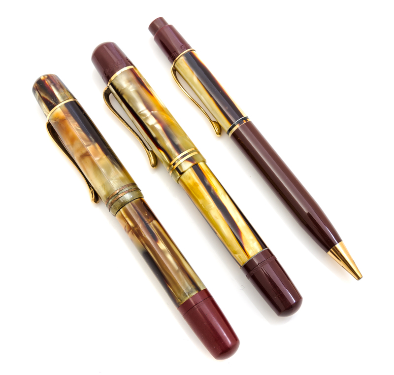 comprising two fountain pens with simulated tortoise shell cases and burgundy end cap and 14-karat gold nibs, together with a similarly decorated Gunther Wagner mechanical pencil.