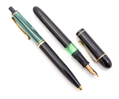 comprising a Gunther Wagner 'Ibis' fountain pen and a Pelikan Roller Pen with a green marbled case.