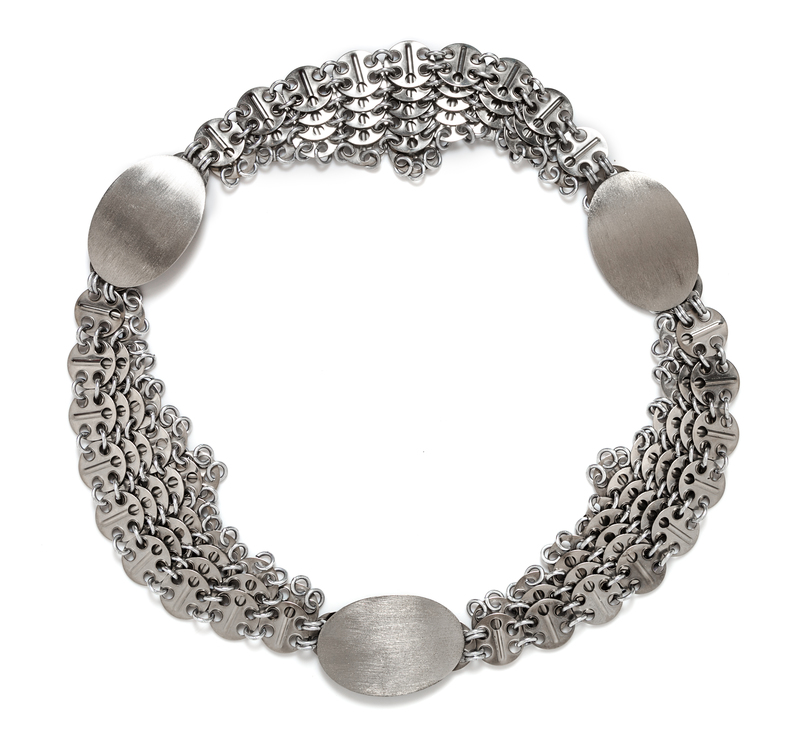 with oval detail, rows of perforated circles connected in a triangular shape and a hook closure.Stamped: Paco Rabanne.