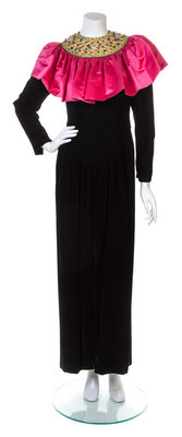 with a fuschia silk ruffle neckline, an attached jeweled bib collar, a drop waist skirt, a front center split hem and a back zip closure.Labeled: Oscar de la Renta.