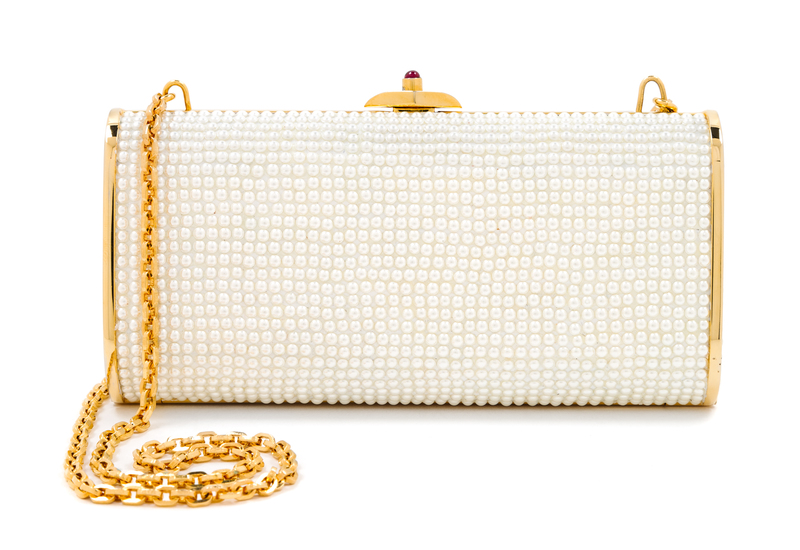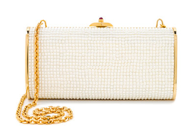 with a goldtone frame, a pink cabachon push button closure and a removable goldtone shoulder strap. Together with a dustbag. Stamped: Judith Leiber.
