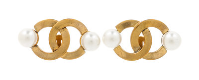 with oversize goldtone "CC" logo detail and faux pearl embellishment. Together with a box.Stamped: Chanel.