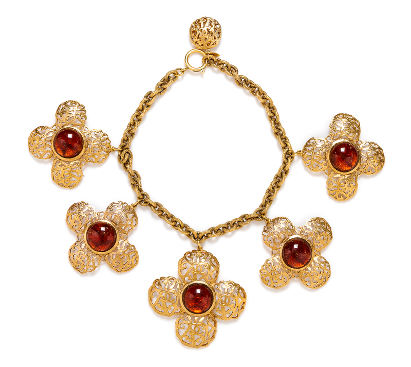 1990,with five large filigree goldtone charms with logo detail and amber gripoix, a textured link chain and a decorative logo charm at the spring ring closure. Together with a box.Stamped: Chanel.