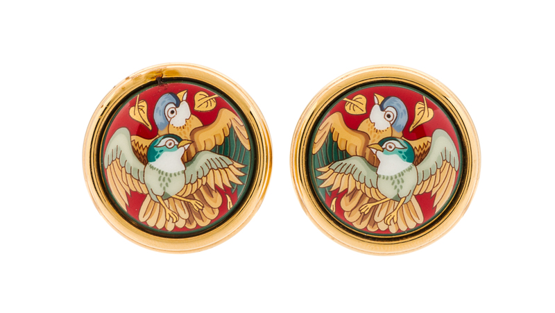 round with an enamel bird motif. Together with a box. Stamped: Hermes.