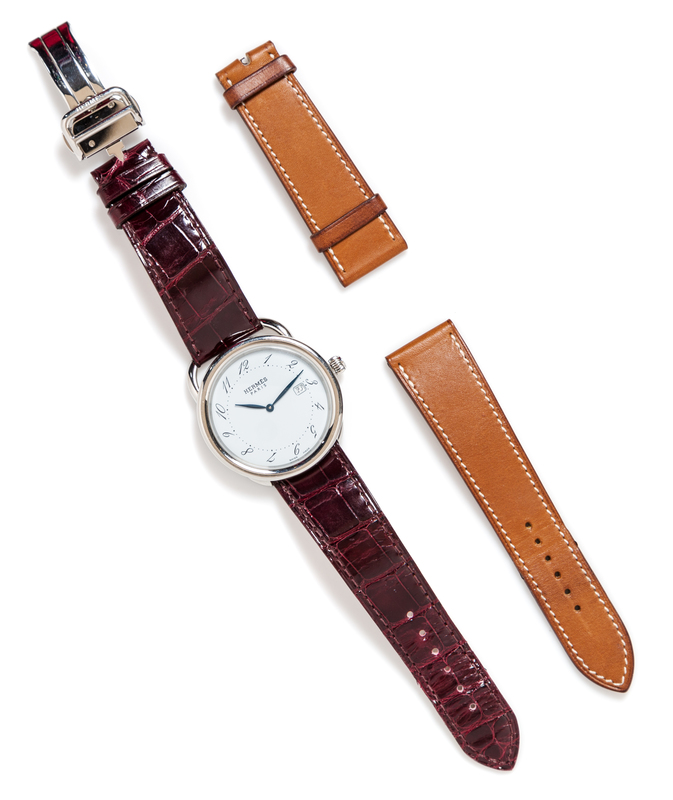 with a white face and a blue tone dial, quartz movement and stainless steel casement and buckle; with an attached Camille Fournet bordeaux alligator strap. Together with the original Hermes light brown leather strap and box. Watch and strap stamped: Hermes.Alligator strap stamped: Camille Fournet.