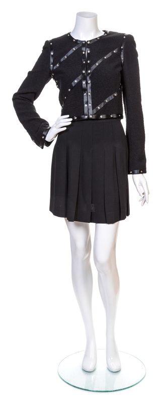 Autumn 2003, comprised of a jacket with decorative black satin trim and a silvertone snap motif with hook and eye closure; together with a black wool pleated skirt from Spring 1995. Each labeled: Chanel.