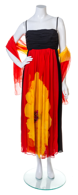 1980's,with a ruched bra bodice, narrow shoulder straps, a four layer skirt of red and black silk chiffon, an oversized poppy print on the front and back top panel of the gown and a back zip closure; together with a matching silk wrap with a red background and a gold poppy.Attributed to: Galanos.