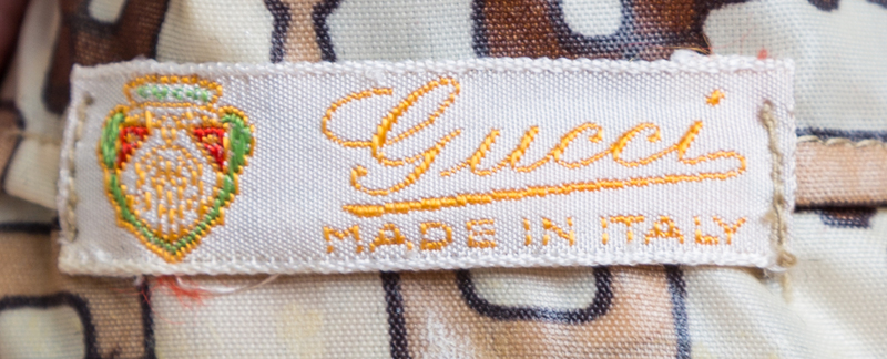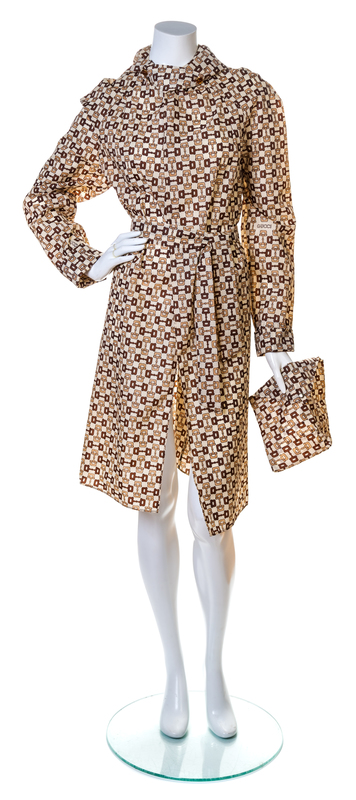 with a brown and tan horsebit motif, a two goldtone logo button closure at the neck and a self-tie belt; together with a matching storage envelope.Each labeled: Gucci.