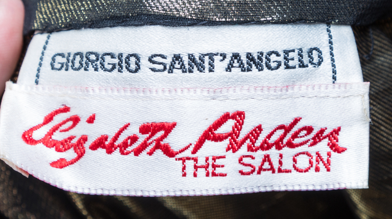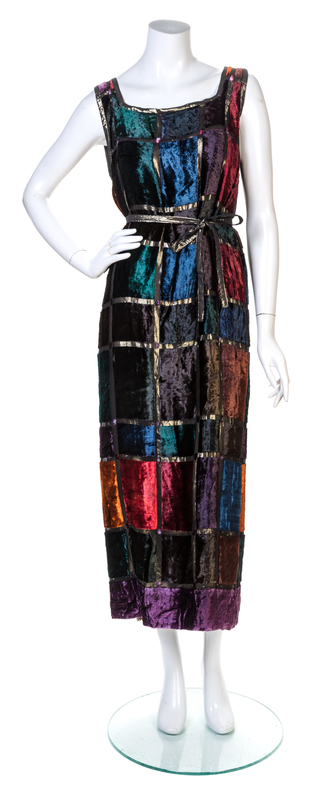 with multicolor velvet squares, gold lam lining and sheer black trim detail; together with a gold lam tie belt.Labeled: Giorgio Sant'Angelo.
