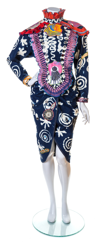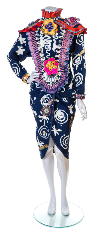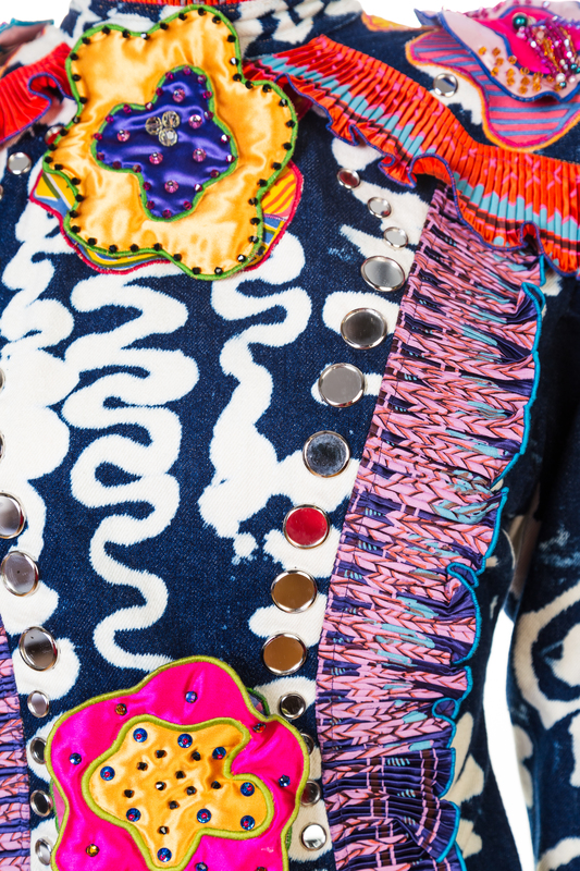 1988,"The Fantastic Flower Garden Collection",showcasing a wide range of techniques including applique, pleating, hand painting and screen printed fabrics with a back button closure; together with four detachable floral brooches.Labeled and signed: Zandra Rhodes.
