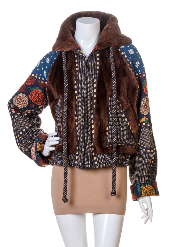 with tweed trim, a faux fur back and front faux fur detail, a front zip closure, front pockets and a floral interior lining.Labeled: Koos Van Den Akker.