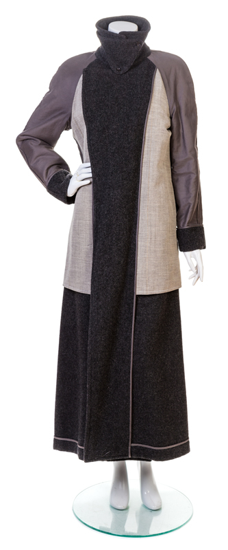 1998, double breasted with taupe linen inset panels, gray cotton sleeves with a flannel cuff, hook and eye front closure and back pleat detailing.Labeled: Comme des Garcons.