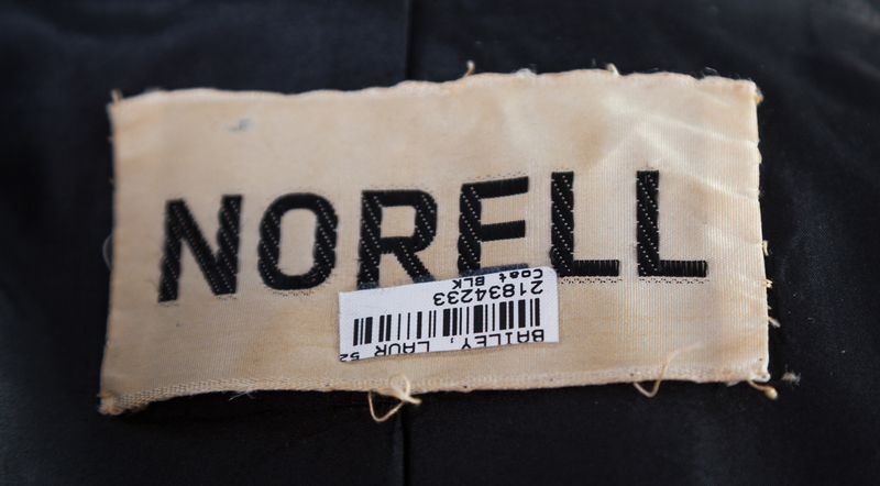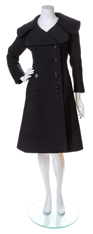 with a rounded notched lapel, decorative button detail on the sleeves and front slip pockets.Labeled: Norell.