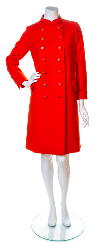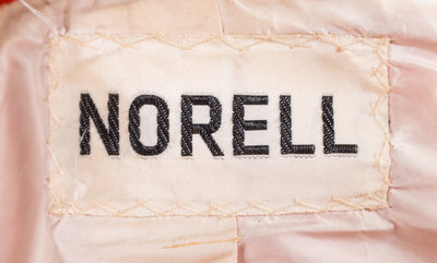 with a mandarin collar, button detail on the sleeves and front flap pockets.Labeled: Norell.