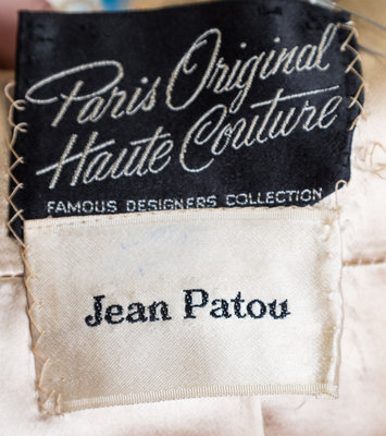 with decorative faux wood buttons at the front closure and flap pockets and a back kick pleat.Labeled: Jean Patou.