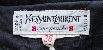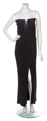 strapless with an architectural neckline, ruched silk waist detail, a front split hem and a side zip closure.Labeled: Yves Saint Laurent Rive Gauche.