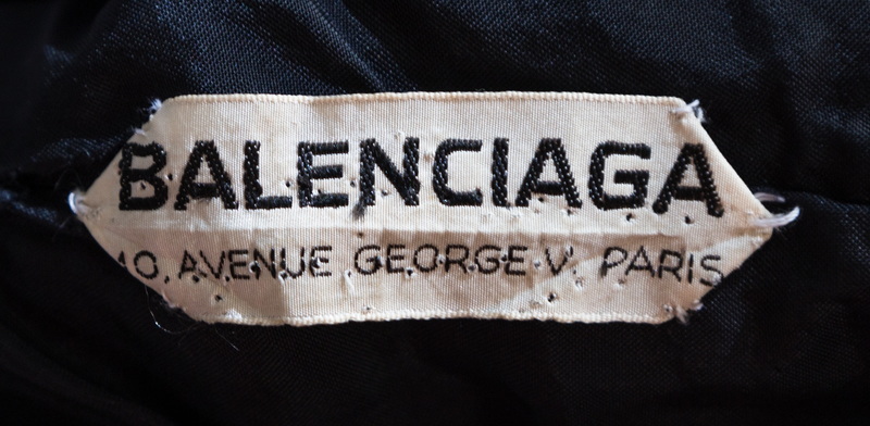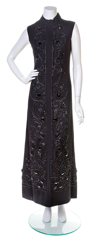 1960's,sleeveless with a high neck collar and elaborate, heavy black beadwork and a back zip closure.Labeled: Balenciaga.